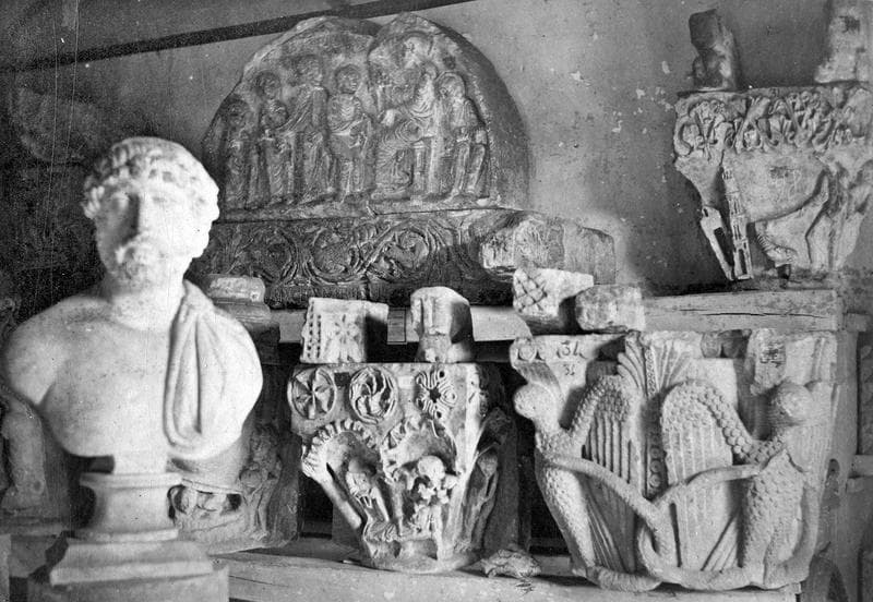 fragments architecturaux : chapiteaux, buste, corbeaux de pierre, tympan