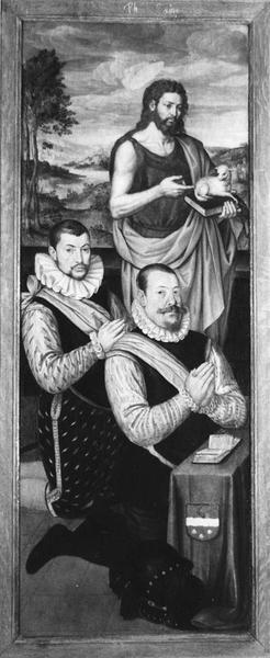 retable triptyque, vue partielle, représentation de Saint Jean-Baptiste et d'hommes en donateurs
