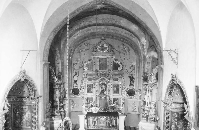 Intérieur : choeur avec retable et maître-autel, vu en plongée