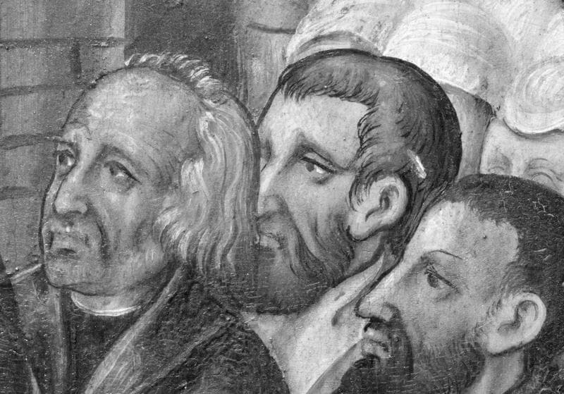 Retable de saint Martin : deuxième registre droit, le miracle de la Messe de saint Martin, détail des têtes des assistants