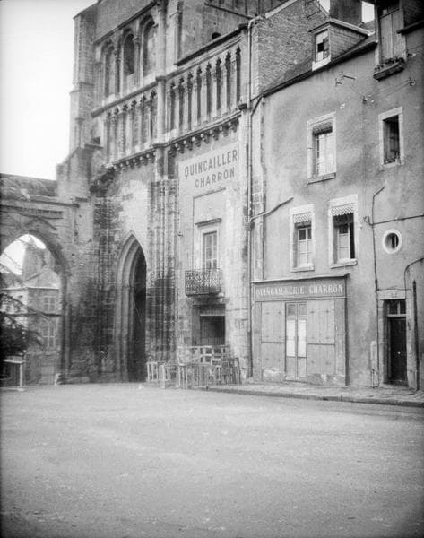 POP | Plateforme ouverte du patrimoineBase du clocher et façade sud de l'ancienne nef, vue partielle avec boutique d'un quincailler et charron ; maisons