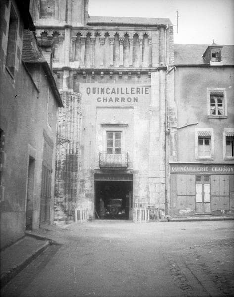Façade sud de l'ancienne nef, vue partielle avec boutique d'un quincailler et charron