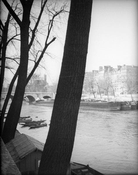 POP | Plateforme ouverte du patrimoinePont sur la Seine avec péniches et barques, vus à travers les arbres du quai d'Anjou côté est
