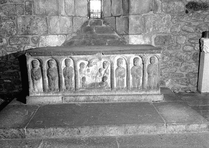 Bas-relief en pierre, autel de la crypte : personnages sous arcades