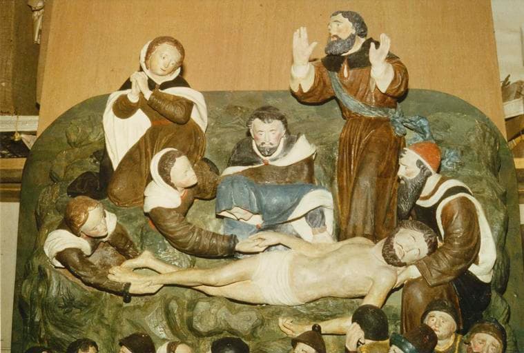 haut-relief (fragment de retable en bois polychrome) : la déploration du Christ. Partie supérieure, après restauration.