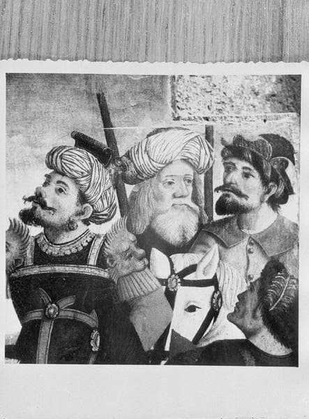 Tableau : la Crucifixion, détail des cavaliers et soldats en armes
