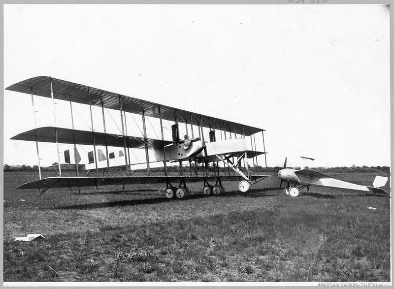 POP | Plateforme ouverte du patrimoineBombardier triplan italien Caproni sur le terrain d'aviation de Taliedo, avec en face un petit avion équipé d'un mitrailleuse