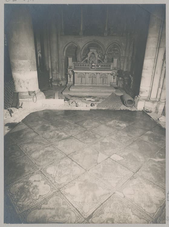 POP | Plateforme ouverte du patrimoineTransept, croisillon sud : carrelage de la chapelle Saint-Éloi, vue d'ensemble avant évacuation