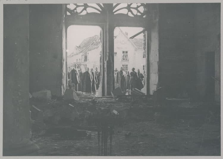 POP | Plateforme ouverte du patrimoinePortail du croisillon sud du transept, après les bombardements ; Visiteurs : la mission agricole américaine