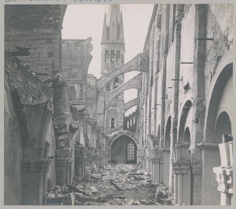 POP | Plateforme ouverte du patrimoineLa voûte du bas-côté sud, effondrée suite aux bombardements ; La tour sud et les arcs-boutants visibles