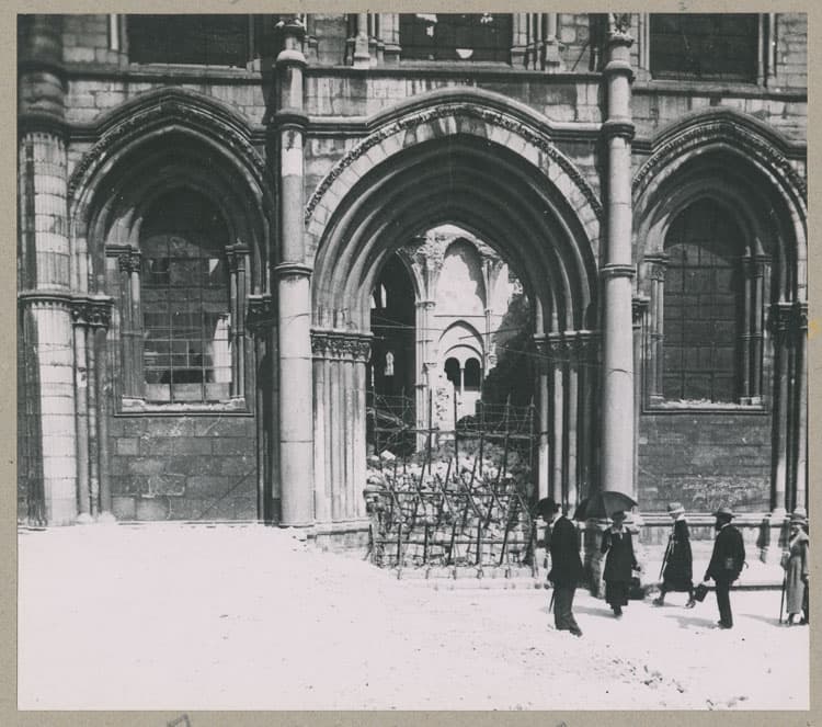 POP | Plateforme ouverte du patrimoineFaçade ouest : porche défendu par un réseau de fils barbelés ; Visiteurs
