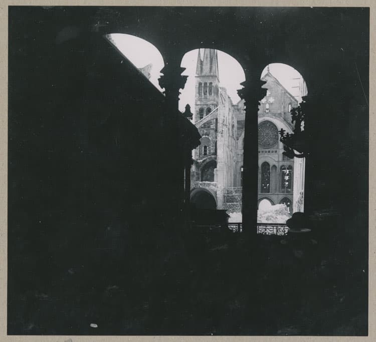 POP | Plateforme ouverte du patrimoineLa nef et le clocher sud, depuis la tribune du chevet ; Toiture détruite par les bombardements et façade sud effondrée