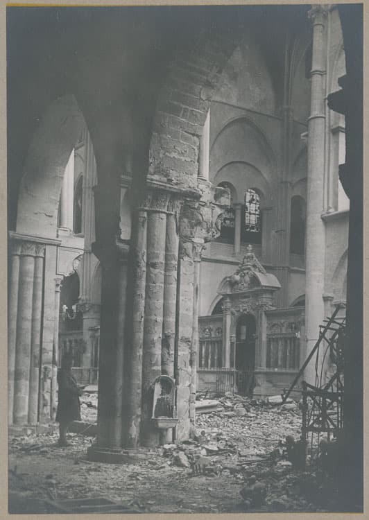 POP | Plateforme ouverte du patrimoineTransept, croisillon nord : la clôture de choeur depuis le bas-côté sud, détériorée les bombardements