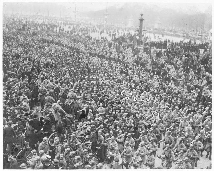 Troupes françaises essayant de se frayer un passage à travers la foule. Place de la Concorde après le passage du président Wilson
