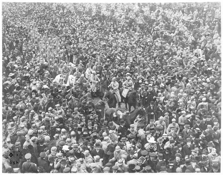 Troupes françaises et musique militaire essayant de se frayer un passage à travers la foule. Place de la Concorde après le passage du président Wilson