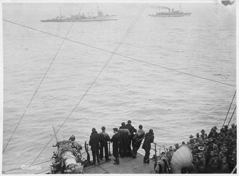 POP | Plateforme ouverte du patrimoineSoldats et artilleurs de marine sur un bateau américain, regardant un pétrolier faisant la course avec un sous-marin qui vient d'apparaître