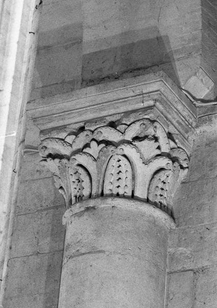 Intérieur, croisée du transept, pilier sud-ouest, demi-colonne engagée ouest : chapiteau orné de motifs végétaux, côté sud-ouest