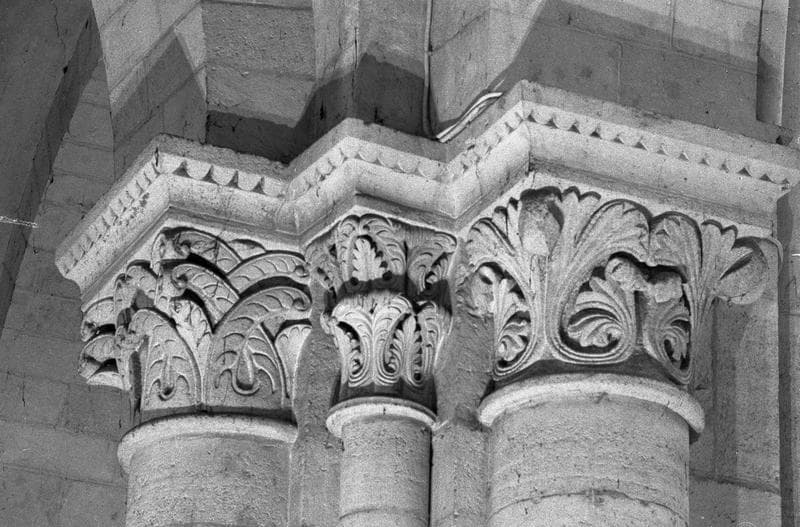 Intérieur, nef, huitième pilier sud, demi-colonnes engagées sud et est : chapiteaux ornés de feuilles d'acanthe
