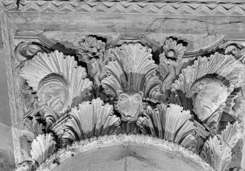 POP | Plateforme ouverte du patrimoineIntérieur, nef, premier pilier sud : chapiteau orné de motifs végétaux et de diverses têtes de personnages