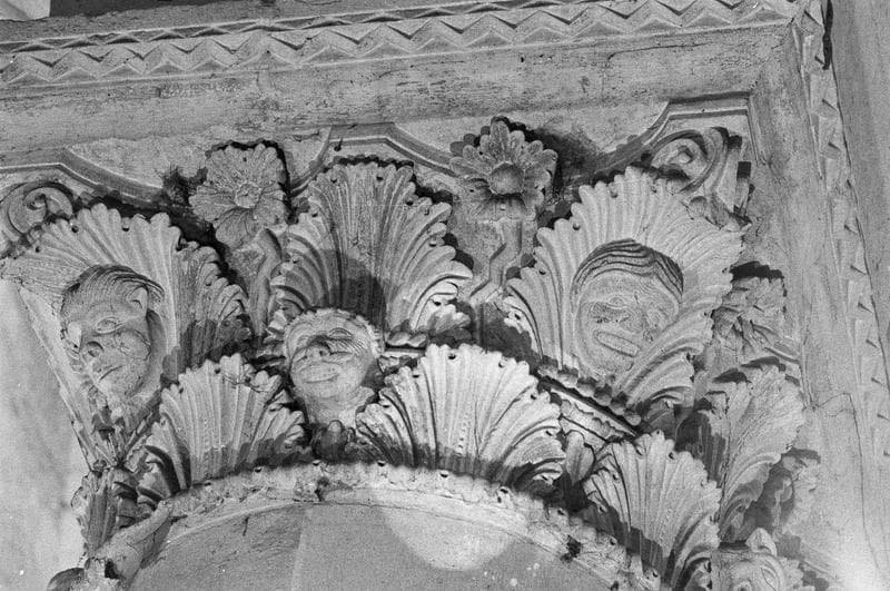 POP | Plateforme ouverte du patrimoineIntérieur, nef, premier pilier sud : chapiteau orné de motifs végétaux et de diverses têtes de personnages