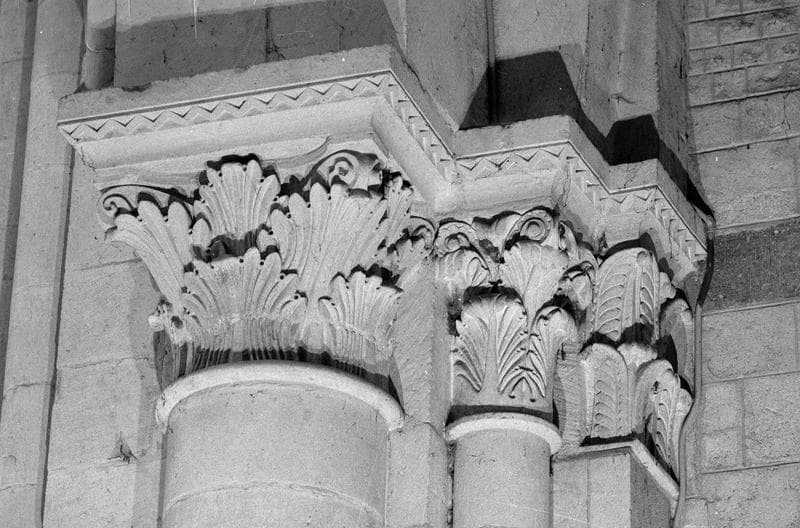 POP | Plateforme ouverte du patrimoineIntérieur, nef, pilier nord au revers de la façade ouest, demi-colonnes engagées : chapiteaux ornés de feuilles d'acanthe, côté nord-est