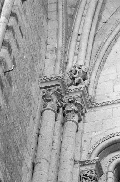 POP | Plateforme ouverte du patrimoineIntérieur, nef, angle nord-ouest : retombée des arcs de la voûte sur chapiteaux ornés de feuilles d'acanthe surmontés d'une scène de massacre