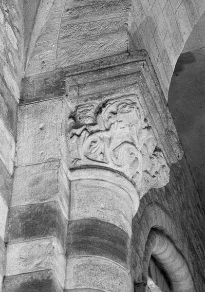 POP | Plateforme ouverte du patrimoineIntérieur, bas-côté sud, neuvième pilier : chapiteau orné de motifs végétaux et d'un personnage, côté nord-est