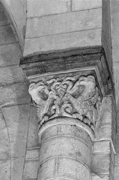 Intérieur, bas-côté sud, cinquième pilier : chapiteau orné de deux griffons, côté nord