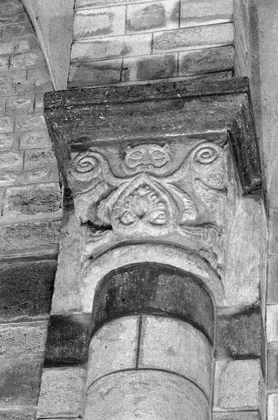 Intérieur, bas-côté sud, troisième pilier : chapiteau orné d'animaux fantastiques, côté nord