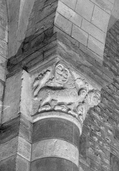 Intérieur, bas-côté sud, première pilier : chapiteau orné de deux animaux fantastiques, côté nord-est