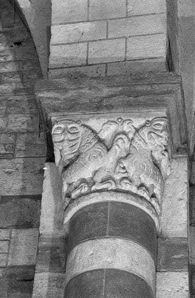 Intérieur, bas-côté sud, première pilier : chapiteau orné de deux animaux fantastiques, côté nord