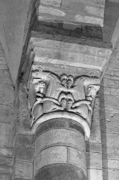 POP | Plateforme ouverte du patrimoineIntérieur, bas-côté nord, premier pilier : chapiteau orné d'animaux, côté sud