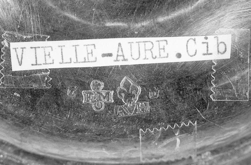 Ciboire : quatre poinçons, dont poinçon du maître François Marre et lettres AVH surmontées d'une fleur de lys (avec étiquette de localisation)