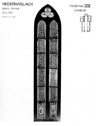 Vierge à l'Enfant et un saint, grisailles, baie VII, panneau de vitrail du choeur