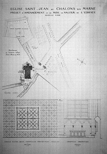 Projet d'aménagement et de mise en valeur : Plan général des abords - Détail d'une grille entre deux chapelle et détail d'un autel