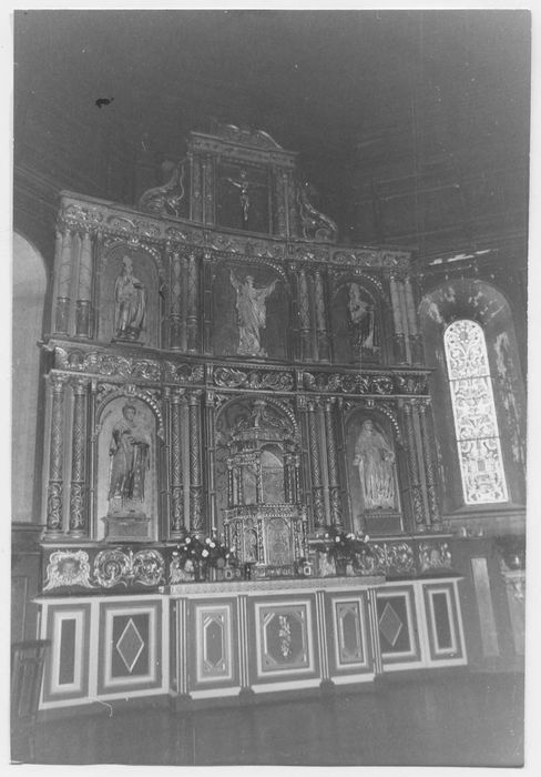 retable du maître-autel et cinq statues : Saint Etienne, Saint Vincent, la Vierge et deux Saints évêques