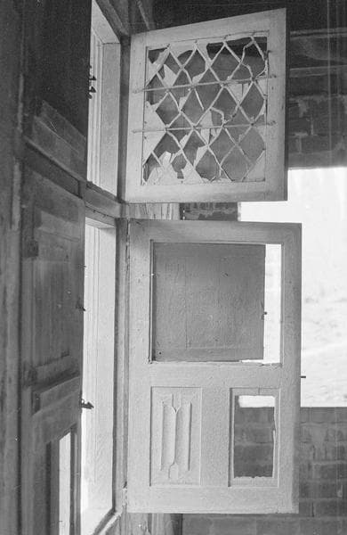 Intérieur : fenêtre à meneaux du deuxième étage, battants vitrés, faces externes