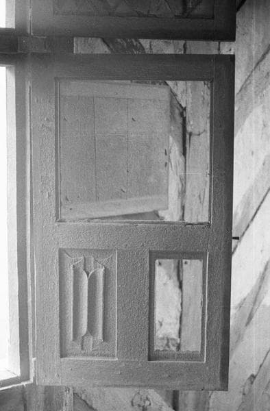 Intérieur : fenêtre à meneaux du deuxième étage, battant vitré inférieur, face externe