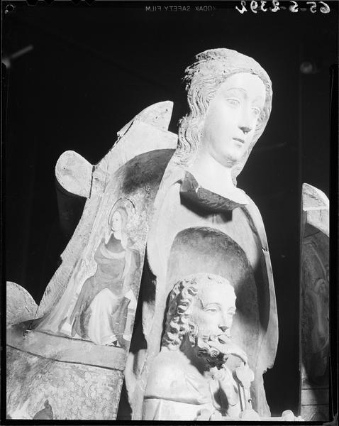Statue ouvrante : Vierge à l'Enfant dite Notre-Dame du Mur, détail des têtes de la Vierge, de l'Enfant et de Dieu le Père de trois quarts droit