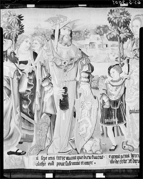 Tenture des Anciens rois des Gaules, troisième pièce murale : Galathès, fils d'Hercule, onzième roi des Gaules, et Lugdus, fondateur de Lyon, détail