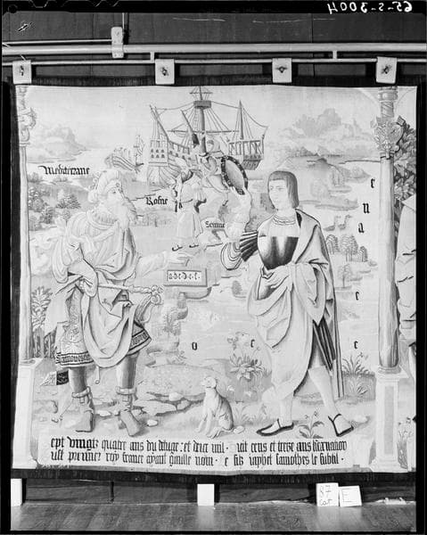 Tenture des Anciens rois des Gaules, première pièce murale : Samothès et Jupiter Celte, premier et neuvième rois des Gaules, détail de la partie gauche représentant Samothès
