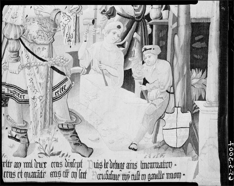 Tenture des Anciens rois des Gaules, première pièce murale : Samothès et Jupiter Celte, premier et neuvième rois des Gaules, détail de la partie droite représentant deux tailleurs de pierre