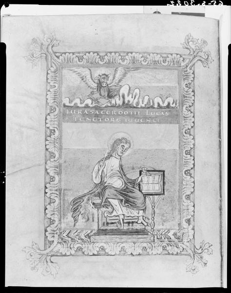 Manuscrit : Evangéliaire de Morienval, page enluminée représentant saint Luc et le boeuf, symbole de l'évangéliste