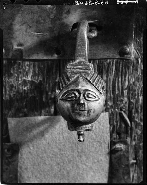 Châsse dite de sainte Anne, détail de la serrure à cadenas ornée d'une tête humaine en ronde-bosse, de face