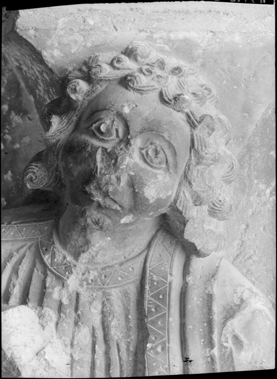 POP | Plateforme ouverte du patrimoineCloître : galerie est, pilier central sud, statue représentant saint Jean l’Évangéliste, tête, détail