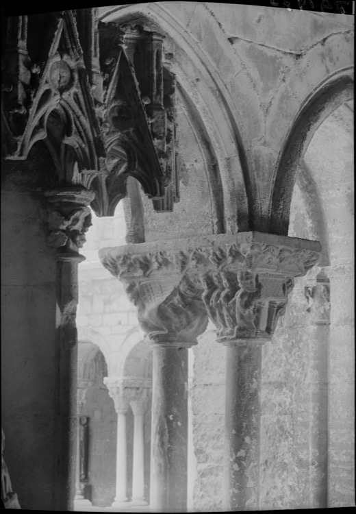 Cloître : galerie sud, chapiteaux n°89 (Les barons devant les reliques de saint Trophime) et n°88 (chimère et masque), face ouest