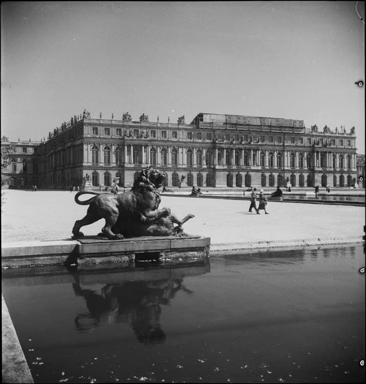 POP | Plateforme ouverte du patrimoineJardins, parterre d’eau : sculpture de lion terrassant un loup du cabinet de Diane ; château : façade sur jardins