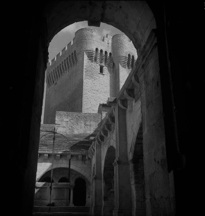POP | Plateforme ouverte du patrimoineParties hautes du donjon vu au travers d’une arcade du cloître