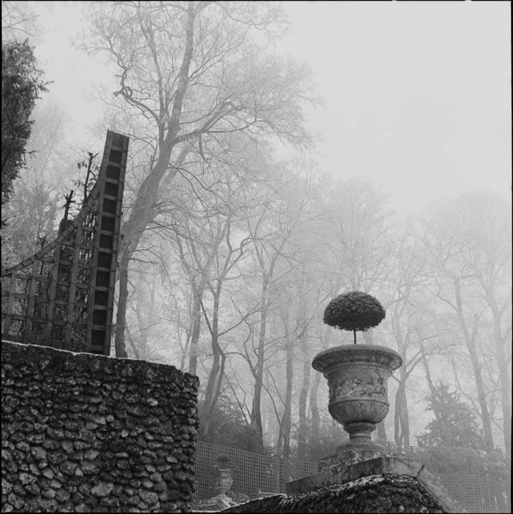 POP | Plateforme ouverte du patrimoineJardins : vase ornemental et arbres dans la brume d’hiver