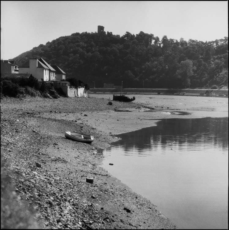 Épaves abandonnées sur une plage ; tour de Cesson en arrière-plan